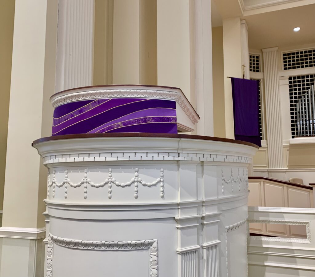 Seasons and celebrations in the Church Year are marked by the changing colors of the lectern hanging and the stoles worn over the ministers’ robes. White is the color for Christmas and Easter as well as weddings, funerals, and memorial services. Purple is used during the preparatory seasons of Advent and Lent. Red reminds us of the flames of Pentecost, and green is used during the non-festival times of the year called ordinary time.